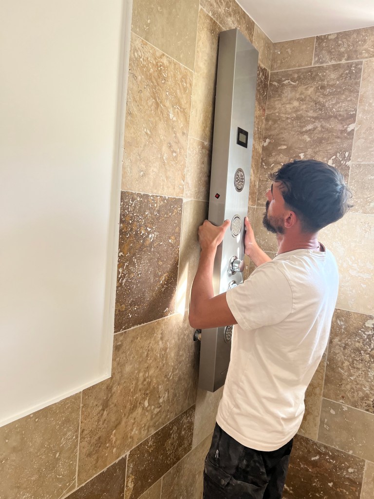 Voici un exemple de rénovation d’une salle de bain, refaite avec ce qu’on appelle du « travertin »