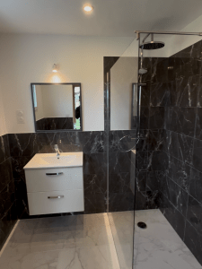 Une salle de bain rénovée avec du carrelage ainsi que de la faïence marbre noir. - Toitures