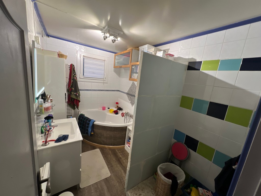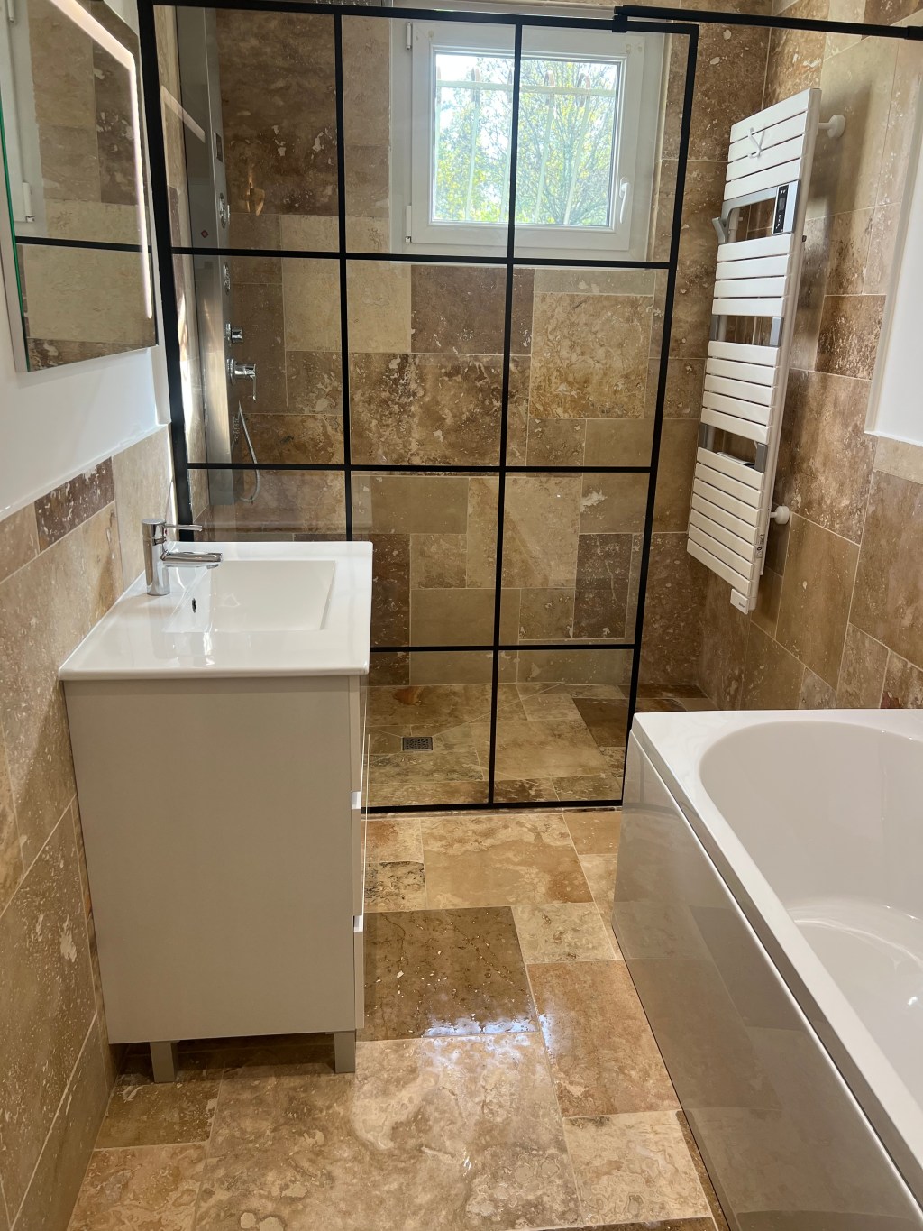 Voici un exemple de rénovation d’une salle de bain, refaite avec ce qu’on appelle du « travertin »