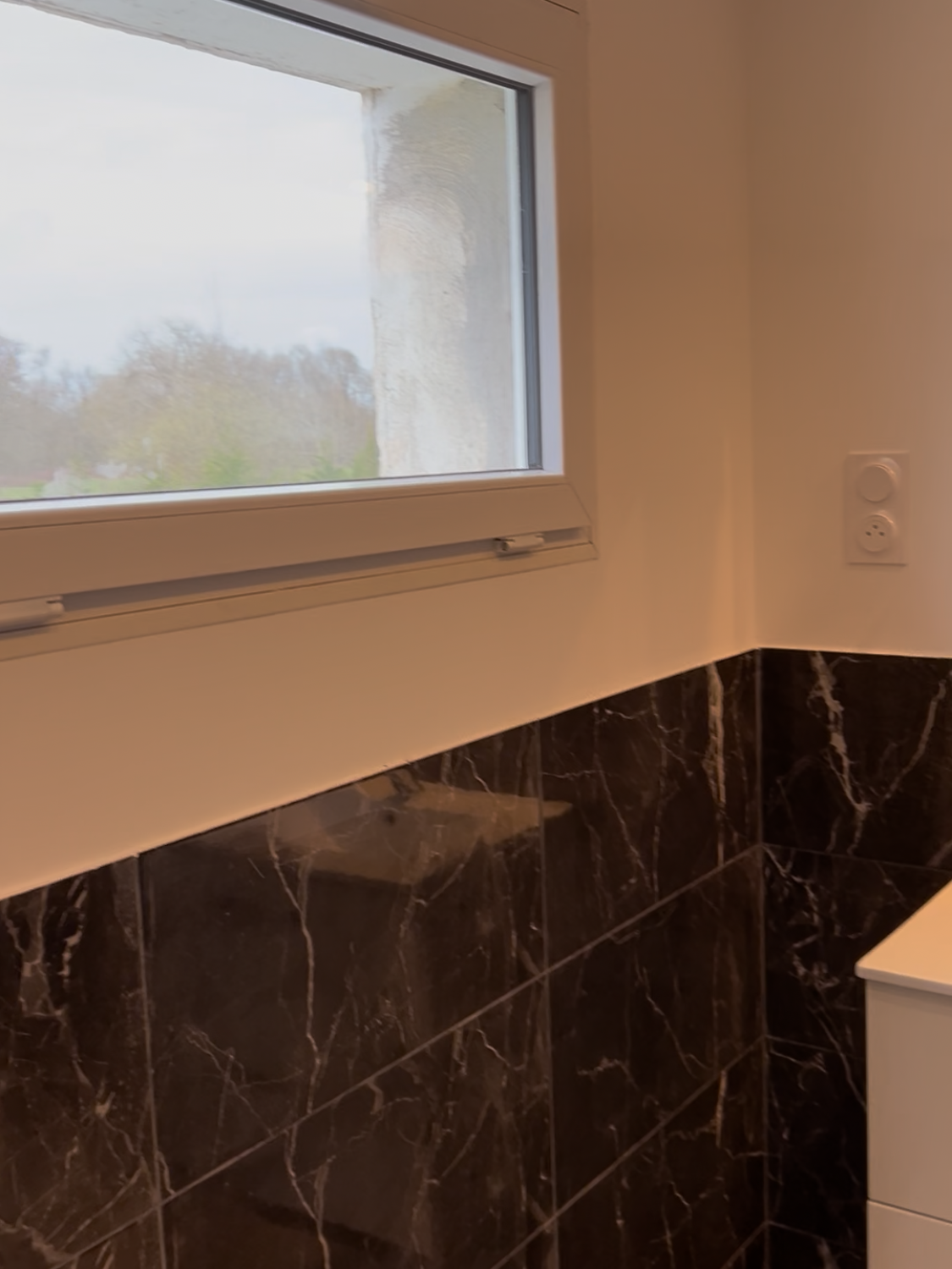 Une salle de bain rénovée avec du carrelage ainsi que de la faïence marbre noir.